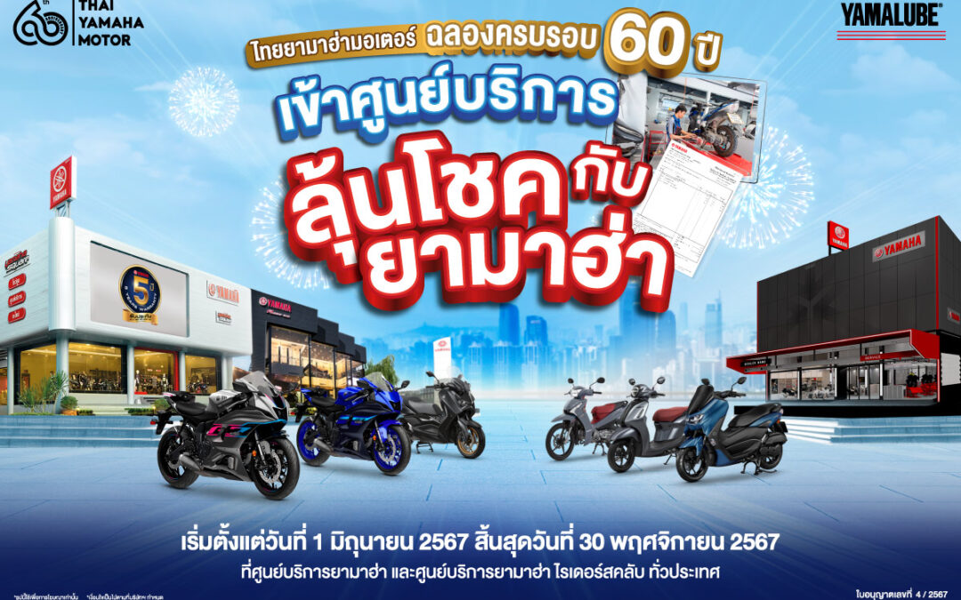 บริษัท ไทยยามาฮ่ามอเตอร์ จำกัด ฉลองครบรอบ 60 ปี ที่ดำเนินธุรกิจผู้ผลิต และจำหน่ายรถจักรยานยนต์ยามาฮ่าในประเทศไทย จัดหนักกับแคมเปญ “เข้าศูนย์บริการ ลุ้นโชคกับยามาฮ่า” พิเศษสุดสำหรับลูกค้ารถจักรยานยนต์ยามาฮ่าทั่วประเทศ ทั้งรถ Standard Bike และ Big Bike เมื่อนำรถเข้ารับบริการ ซ่อม บำรุงรักษา หรือเปลี่ยนอะไหล่ ที่ศูนย์บริการยามาฮ่า และยามาฮ่า ไรเดอร์สคลับ ทั่วประเทศ เพื่อเป็นการส่งเสริมการใช้อะไหล่ยามาฮ่าแท้ และการเข้าศูนย์บริการยามาฮ่า เริ่มวันที่ 1 มิถุนายน 2567 ถึงวันที่ 30 พฤศจิกายน 2567 โดยลูกค้าที่ใช้บริการในศูนย์บริการยามาฮ่า ที่มียอดค่าใช้จ่าย 300 บาทขึ้นไป (ไม่รวมค่าแรง) รับ 1 สิทธิ์ จำกัดสูงสุด 3 สิทธิ์ ต่อ 1 ใบเสร็จ ต่อคนต่อวัน เพียงสแกน QR Code ที่เคาน์เตอร์แคชเชียร์ กรอกข้อมูล ชื่อร้านผู้จำหน่ายที่ใช้บริการ, จังหวัดที่ใช้บริการ ,ชื่อ-นามสกุล, เบอร์โทรศัพท์, เลขที่ใบเสร็จ, วันที่ในใบเสร็จรับเงิน และอัปโหลดรูปใบเสร็จให้ชัดเจน พร้อมยอมรับเงื่อนไข และเก็บใบเสร็จไว้เป็นหลักฐานเพื่อลุ้นรางวัลใหญ่ ทองคำมูลค่า 5,011.47 บาท รวม 50 รางวัล และรางวัลอื่นๆ อีกมากมาย รวม 600 รางวัล รวมมูลค่าทั้งสิ้น 720,573.50 บาท